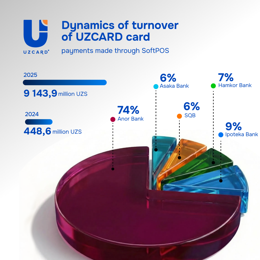 By the end of 2025, the volume of payments using UZCARD cards via SoftPOS exceeded 9 billion UZS – 20 times more than in 2024. The largest growth was demonstrated by Anor Bank, whose share in the overall structure of payments via SoftPOS amounted to 74%. The top three also included Ipoteka Bank and Hamkor Bank with shares of 9% and 7%, respectively. SQB also demonstrated significant growth: from July to December 2025, the bank’s volume of transactions via SoftPOS increased 22-fold.