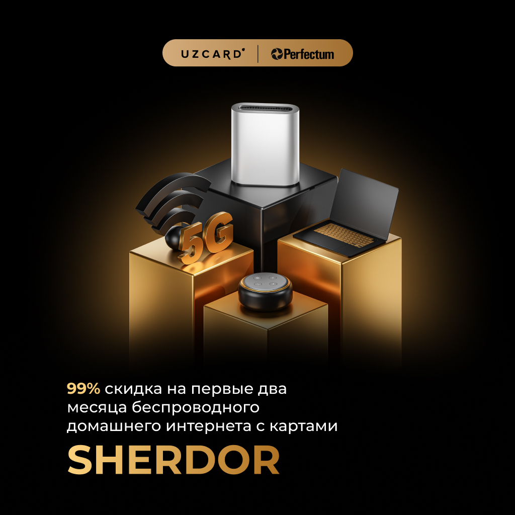 В партнерстве с мобильным оператором Perfectum, держателям премиальных карт UZCARD SHERDOR предоставляется специальное предложение: беспроводной домашний интернет со скидкой 99% в течение первых двух месяцев.
