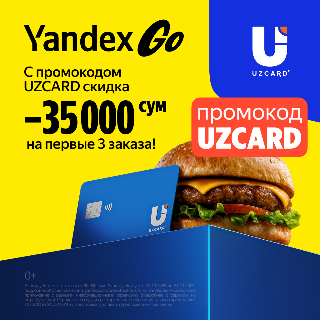 UZCARD продолжает расширять возможности для своих клиентов, предлагая бонусы в разных сферах повседневной жизни. Теперь держателей карт UZCARD ждёт новая выгода: скидка 35 000 сум на каждый из первых трёх заказов в приложении Yandex Eats.