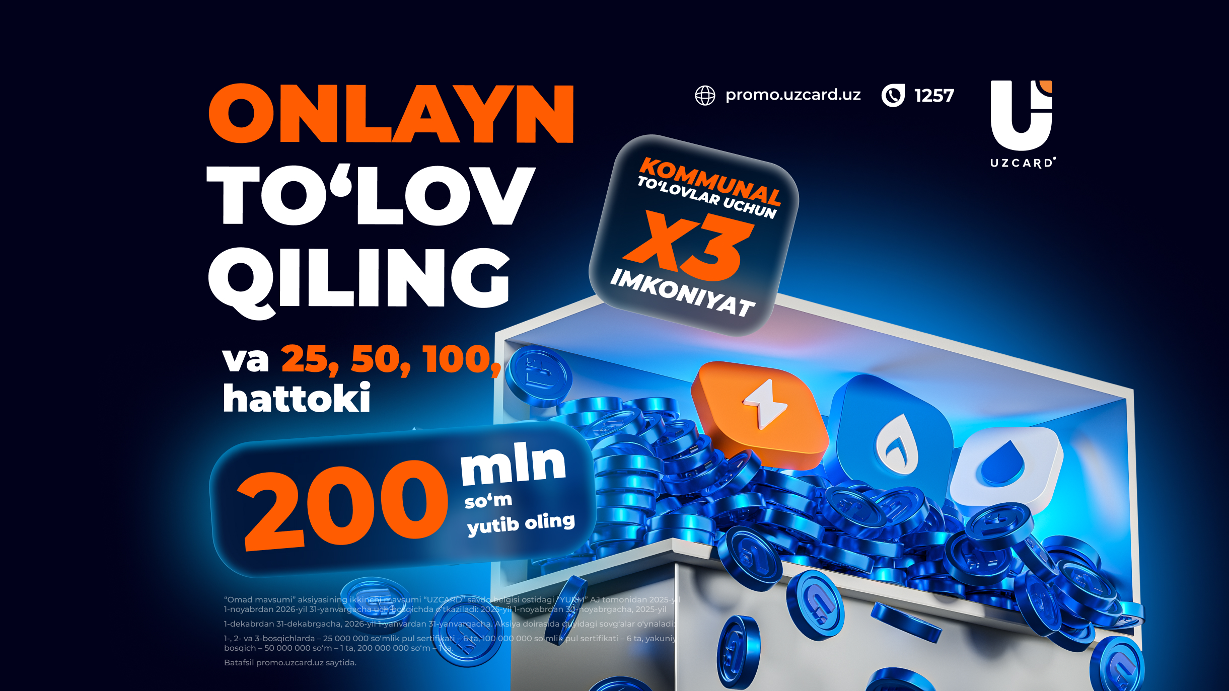 UZCARD “Omad mavsumi” aksiyasini uzaytiradi va 1 milliard so‘mlik sovrin jamg‘armasi bilan ikkinchi mavsumni e’lon qiladi! Aksiyaning ikkinchi mavsumi yana uch oy davom etadi — 2025-yil 1-noyabrdan 2026-yil 31-yanvargacha. Ushbu mavsumda omad ayniqsa kommunal xizmatlari uchun to‘lovni onlayn tarzda amalga oshiruvchilarga kulib boqadi — har bir 50 000 so‘mdan boshlangan chek uchun uchta g‘alaba imkoniyati beriladi; bu oddiy onlayn xaridlar yoki o‘tkazmalarga nisbatan uch baravar ko‘p.