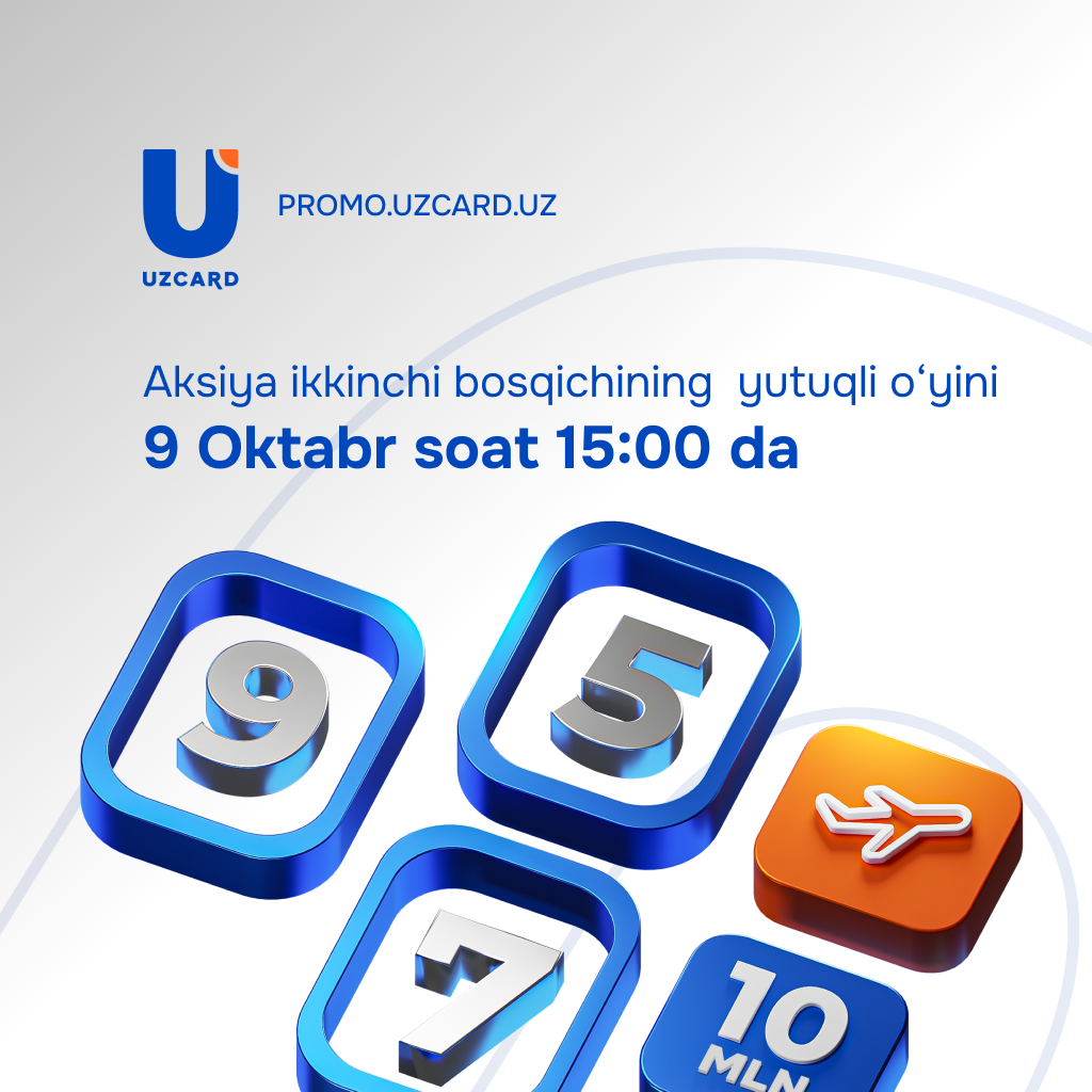 Birinchi bosqichlarda qatnashishga ulgurmaganlar uchinchi bosqichga qo‘shilishlari mumkin. U 2025-yil 1–31-oktabr kunlari davom etadi. UZCARD kartalaridan 50 000 so‘mdan boshlab amalga oshirilgan har qanday onlayn to‘lov bitta imkoniyat, kartadan-kartaga o‘tkazmalar esa ikki baravar imkoniyat beradi. To‘plangan imkoniyatlar sonini @UZCARD_promo_bot Telegram-botida tekshirish mumkin.