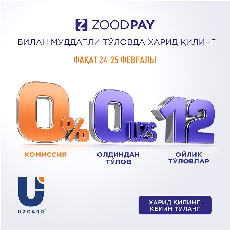 ZoodPay & ZoodMall bilan hamkorlik doirasida UZCARD karta egalari uchun faqat 24-25 fevral kunlari ZoodMallda «0-0-12 Muddatli to‘lov» xizmatini olish noyob imkoniyatiga ega ekanligini ma’lum qilishdan mamnunmiz.